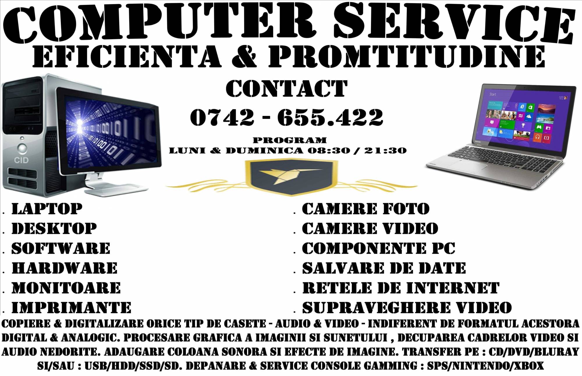 Venim in sprijinul dumneavoastra cu solutii optime si eficiente de : depanare, service, reparatii fizice, si consultanta de specialitate pentru orice tip de : laptop, desktop-pc, server, monitoare-pc, camere foto-video, imprimante, multifunctionale, fax, xerox, console psp, xbox, nintendo, retele de supraveghere video, indiferent de natura problemei ( software & hardware ).