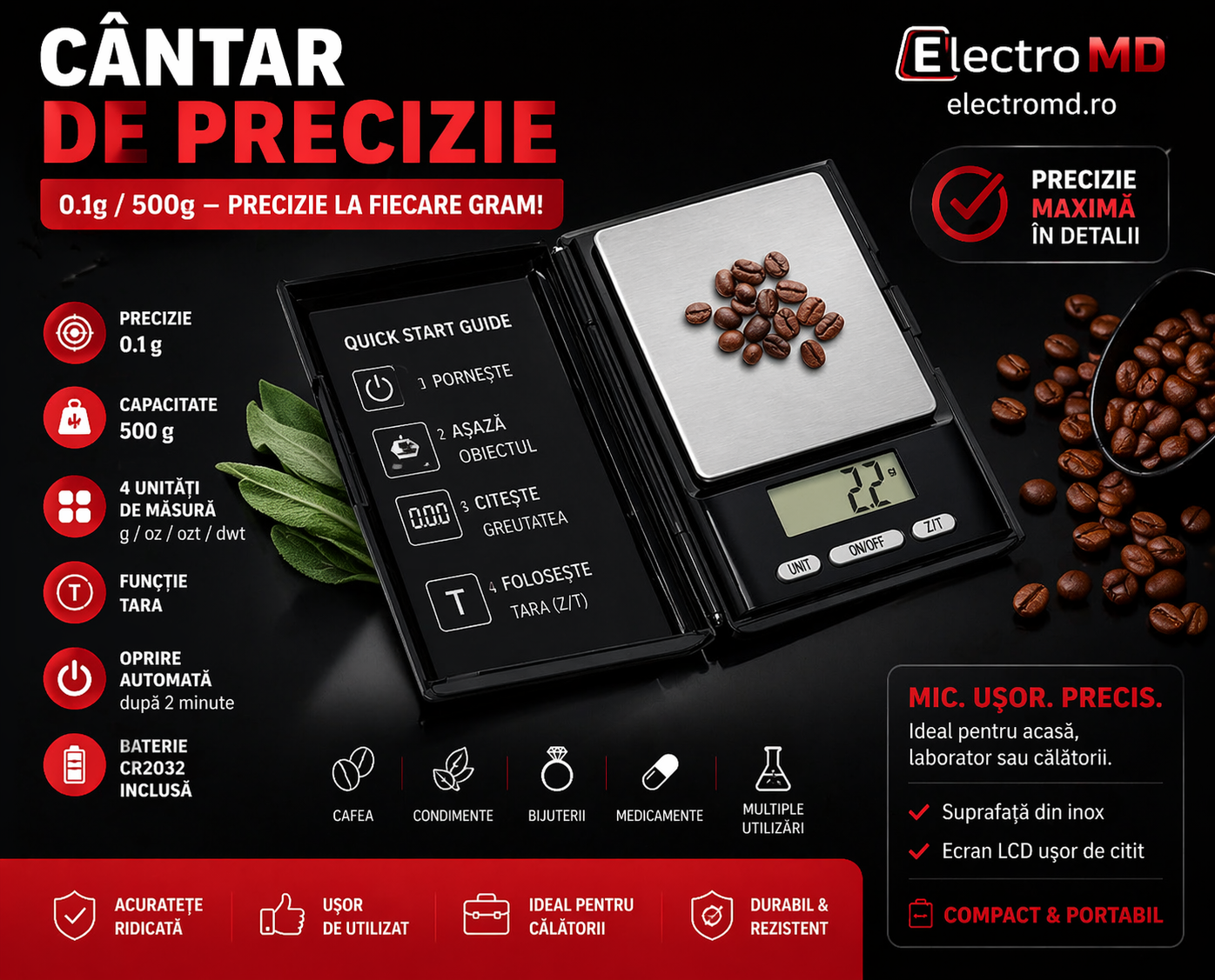 ⚖️ Cântar de precizie 0.1g / 500g digital – ideal pentru cafea, bijuterii și utilizări fine