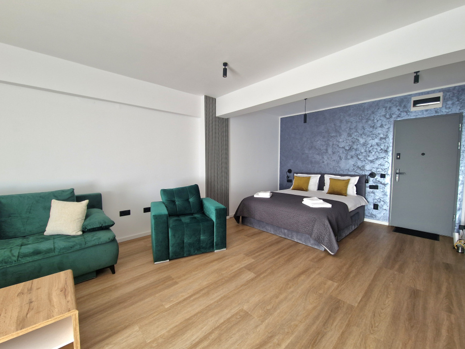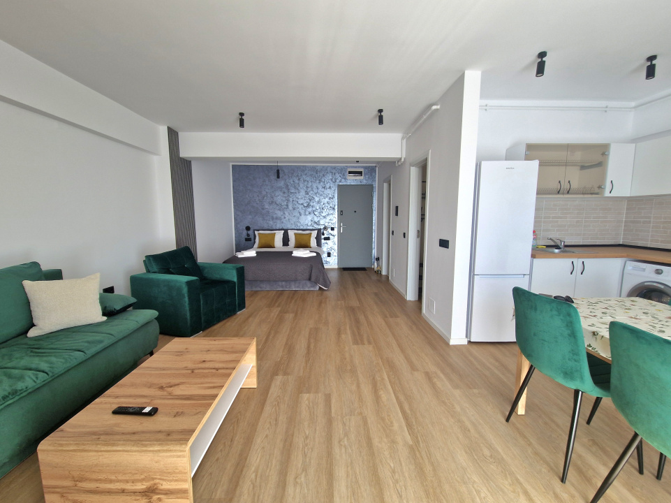 Koncept Imobiliare va ofera spre inchiriere un studio modern situat in cartierul Manastur, pe strada Frunzisului, intr-o zona cu acces rapid catre principalele artere ale orasului si multiple puncte de interes. Proprietatea se afla in apropiere de USAMV si Kaufland Manastur, beneficiind de acces facil catre statii de transport in comun, magazine, farmacii si alte servicii utile pentru viata de zi cu zi. Apartamentul este amplasat la etajul 1 al unui imobil nou construit in anul 2024, cu regim de inaltime S+D+4, dotat cu lift. Locuinta are o suprafata utila de 44,5 mp la care se adauga un balcon deschis de 3,8 mp, cu orientare sud-estica, ce asigura lumina naturala pe parcursul zilei. Compartimentarea este moderna si eficienta, fiind compus dintr-o camera open space cu zona de living si bucatarie complet echipata, baie, dressing walk-in separat si balcon. Apartamentul se preda complet mobilat si utilat modern, fiind pregatit pentru mutare imediata. Printre dotari se numara masina de spalat rufe, frigider, plita, cuptor electric, cuptor cu microunde, hota, cafetiera, televizor si aer conditionat. Incalzirea se realizeaza prin centrala termica proprie cu calorifere, oferind confort termic si control eficient al consumului. Un avantaj important al proprietatii il reprezinta faptul ca apartamentul se afla la prima inchiriere, fiind situat intr-un imobil nou, cu finisaje moderne si compartimentare functionala. De asemenea, orientarea sud-vestica asigura o atmosfera placuta si luminoasa, iar dressingul walk-in separat ofera un spatiu generos pentru depozitare. In pretul chiriei este inclus si un loc de parcare in garajul subteran al imobilului, un beneficiu important in aceasta zona a orasului. Datorita pozitionarii si configuratiei interioare, proprietatea este ideala pentru o persoana singura sau un cuplu, studenti sau angajati care isi doresc o locuinta moderna, confortabila si bine conectata la oras. Pentru informatii suplimentare, programarea unei vizionari sau pentru a afla oferta noastra completa va stam la dispozitie telefonic, prin e-mail sau la sediul agentiei noastre, pe str. Aviator Badescu, nr. 19, Cluj-Napoca.