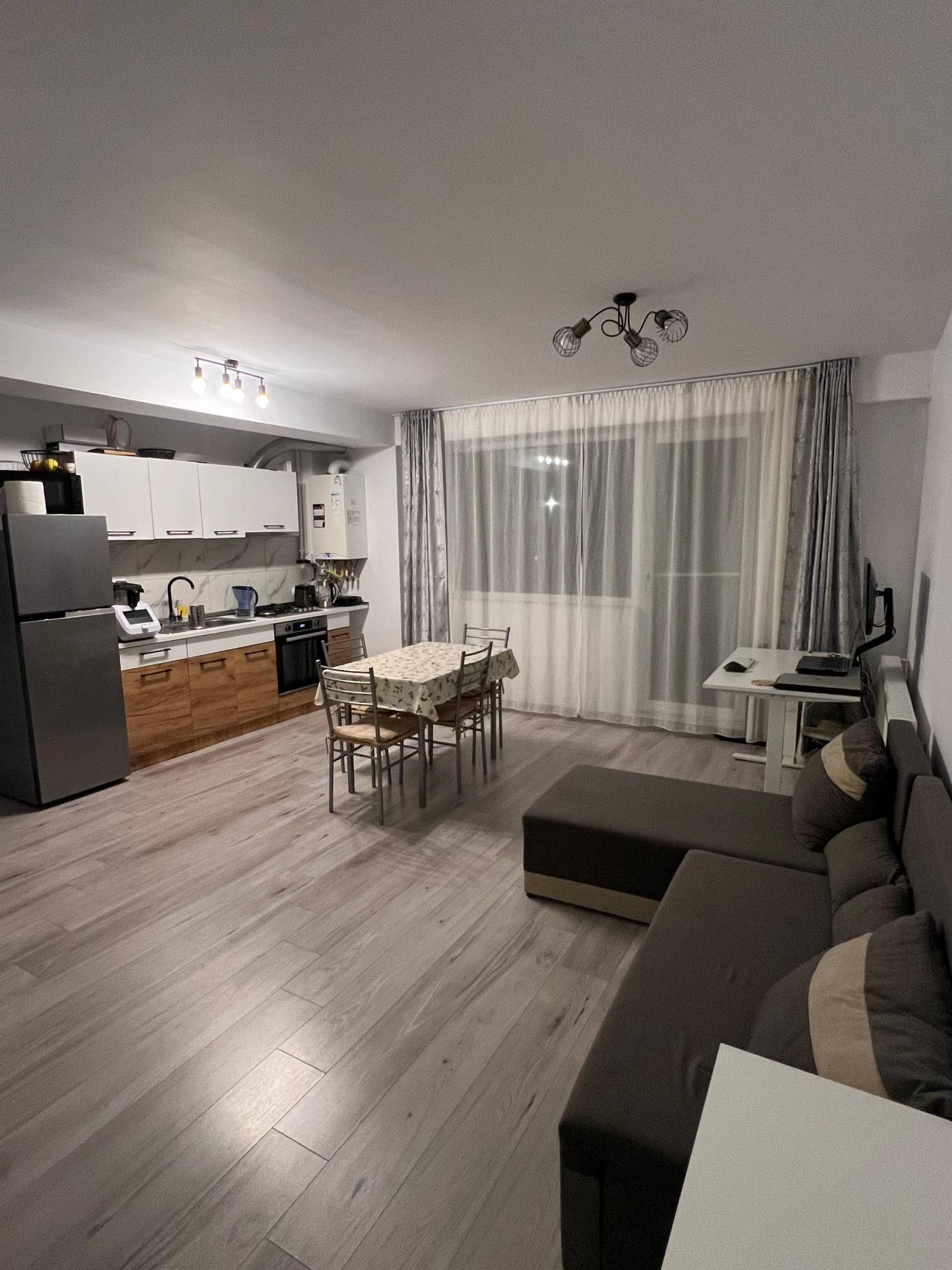 - living cu bucatarie open-space complet utilata, canapea extensibila, loc de luat masa;