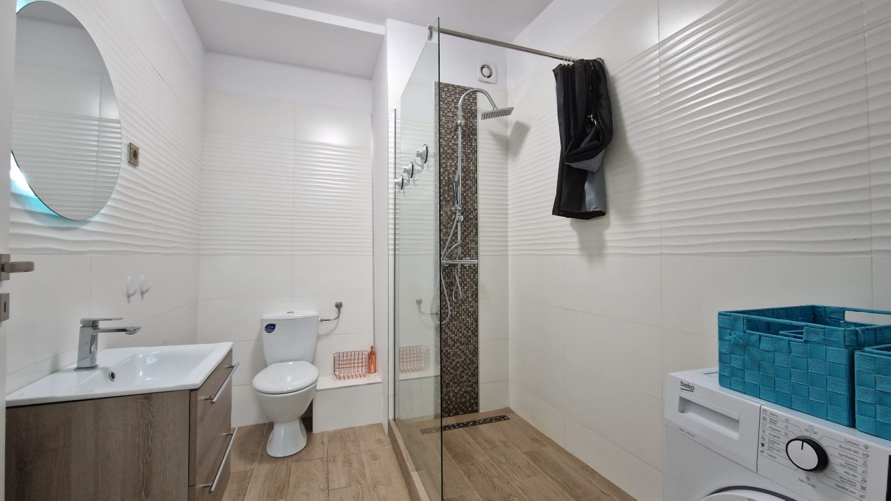 Compartimentarea este eficienta, cu living, bucatarie complet echipata, dormitor, baie si balcon. Se inchiriaza complet mobilat si utilat, fiind dotat cu centrala termica proprie, sistem de incalzire prin pardoseala, masina de spalat rufe, masina de spalat vase, cuptor electric, plita pe gaz, hota si sistem de video-interfon. Finisajele si dotarile sunt alese pentru a raspunde cerintelor unui stil de viata modern si confortabil. Un avantaj important il reprezinta locul de parcare inclus in pret, situat in garajul subteran al imobilului, oferind siguranta si comoditate. Prin pozitionare, panorama, nivelul dotarilor si parcare inclusa, apartamentul se adreseaza in special persoanelor exigente care isi doresc o locuinta moderna, complet echipata, intr-o zona usor accesibila si bine cotata. Pentru informatii suplimentare, programarea unei vizionari sau pentru a afla oferta noastra completa va stam la dispozitie telefonic, prin e-mail sau la sediul agentiei noastre, pe str. Aviator Badescu, nr. 19, Cluj-Napoca.