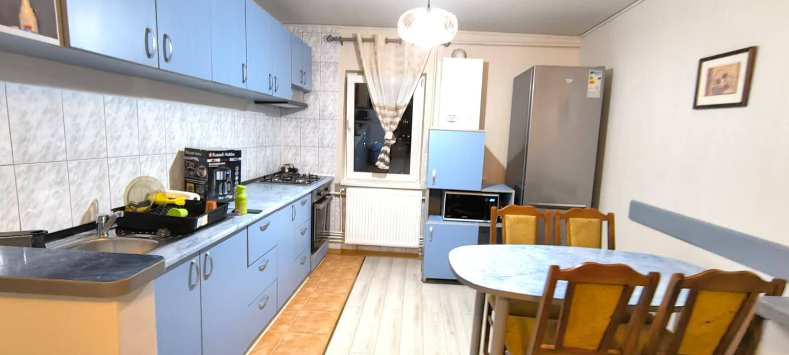 Apartamentul se închiriază complet mobilat și utilat, fiind echipat cu frigider, aragaz, boxă, debara și interfon, oferind un spațiu practic și bine organizat.
