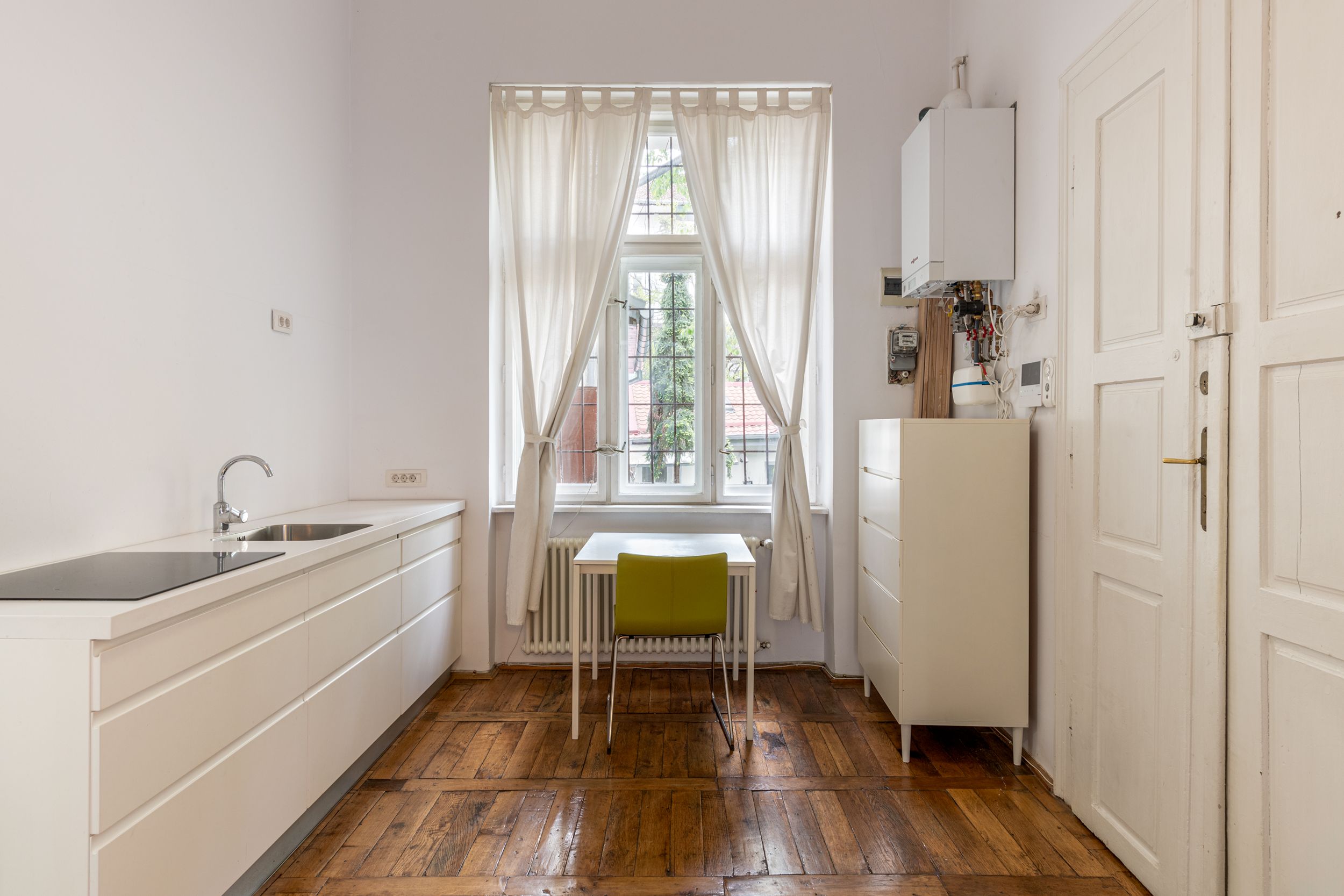 Spațiul are o notă maiestuoasă dată de înălțimea tavanului de 4,2 metri. Este situat la etajul 1 al imobilului și beneficiază de o orientare excelentă, având 3 ferestre mari spre Sud cu vedere la pietonala din Bd. Eroilor, cât și fereastra bucătăriei cu vedere spre curtea interioară cu vegetație.