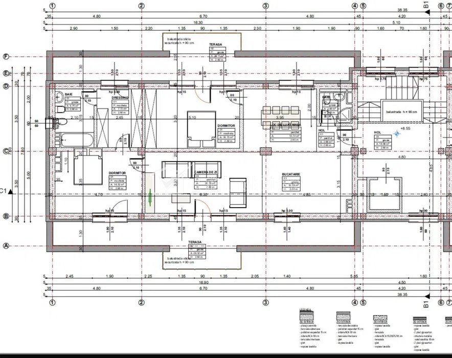 Apartamentul are supafata utila de 105 mp + 2 terase de 30 mp fiecare si este compartimentat astfel: - hol; - baie de serviciu; - bucatarie + living; - dormitor cu baie proprie; - dormitor/birou - 2 terase.
