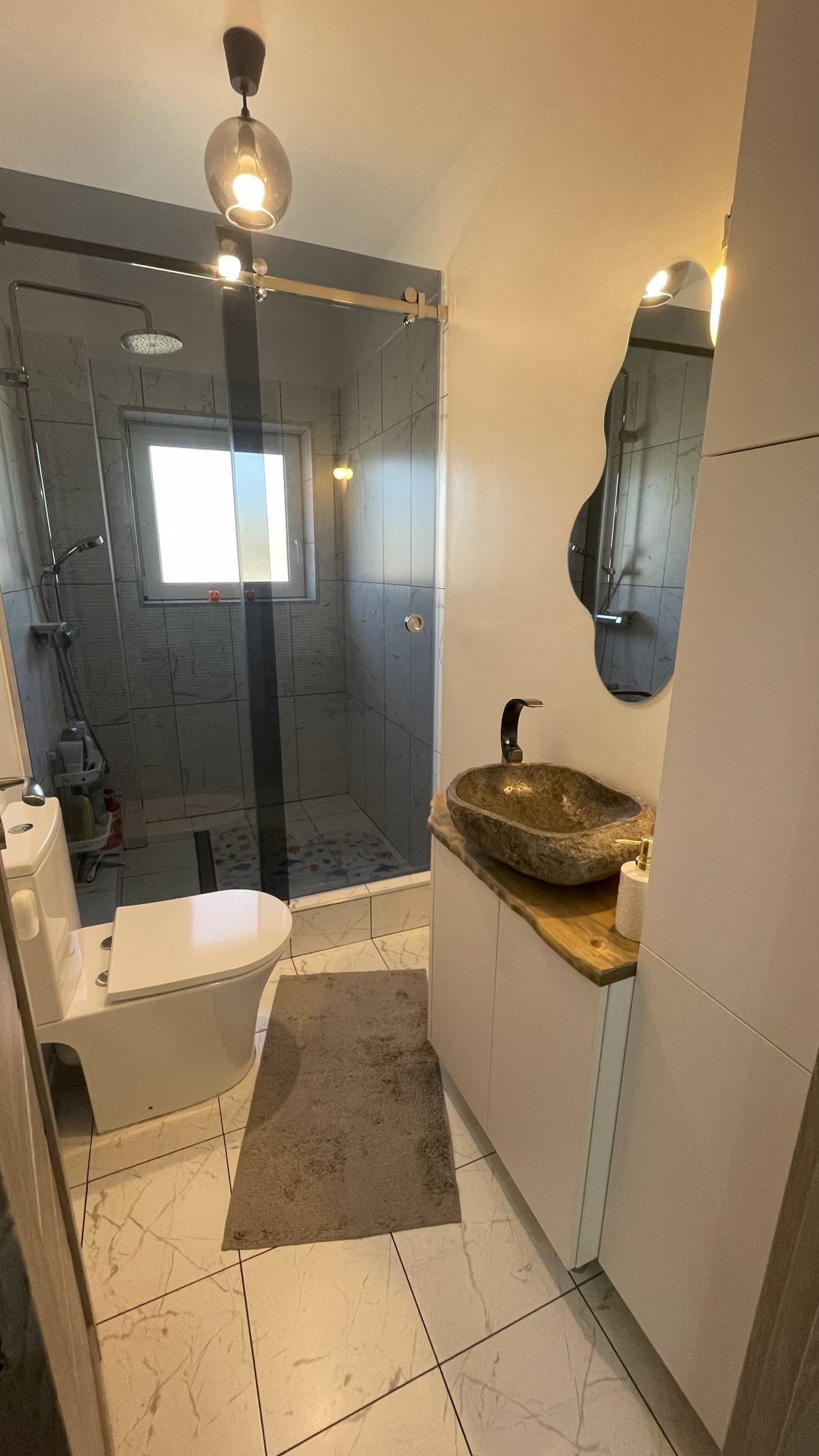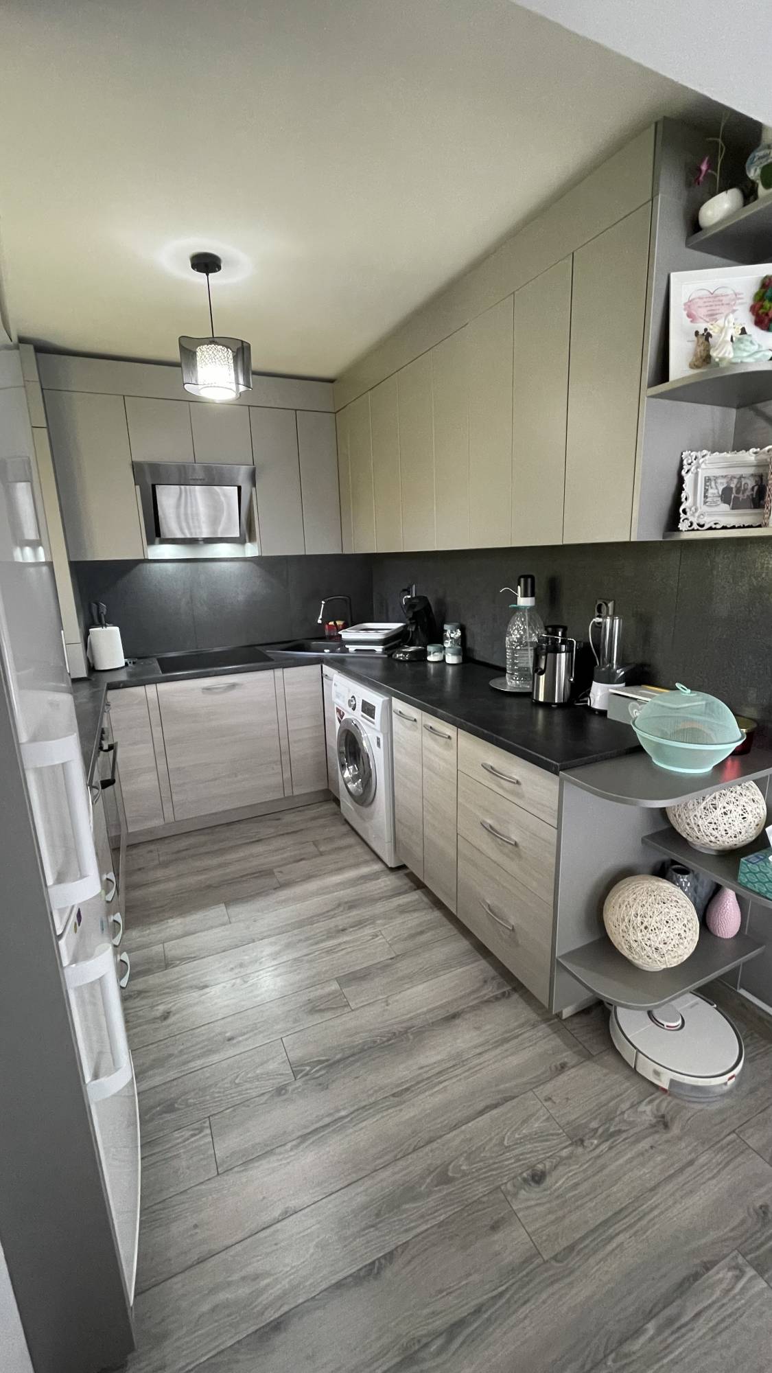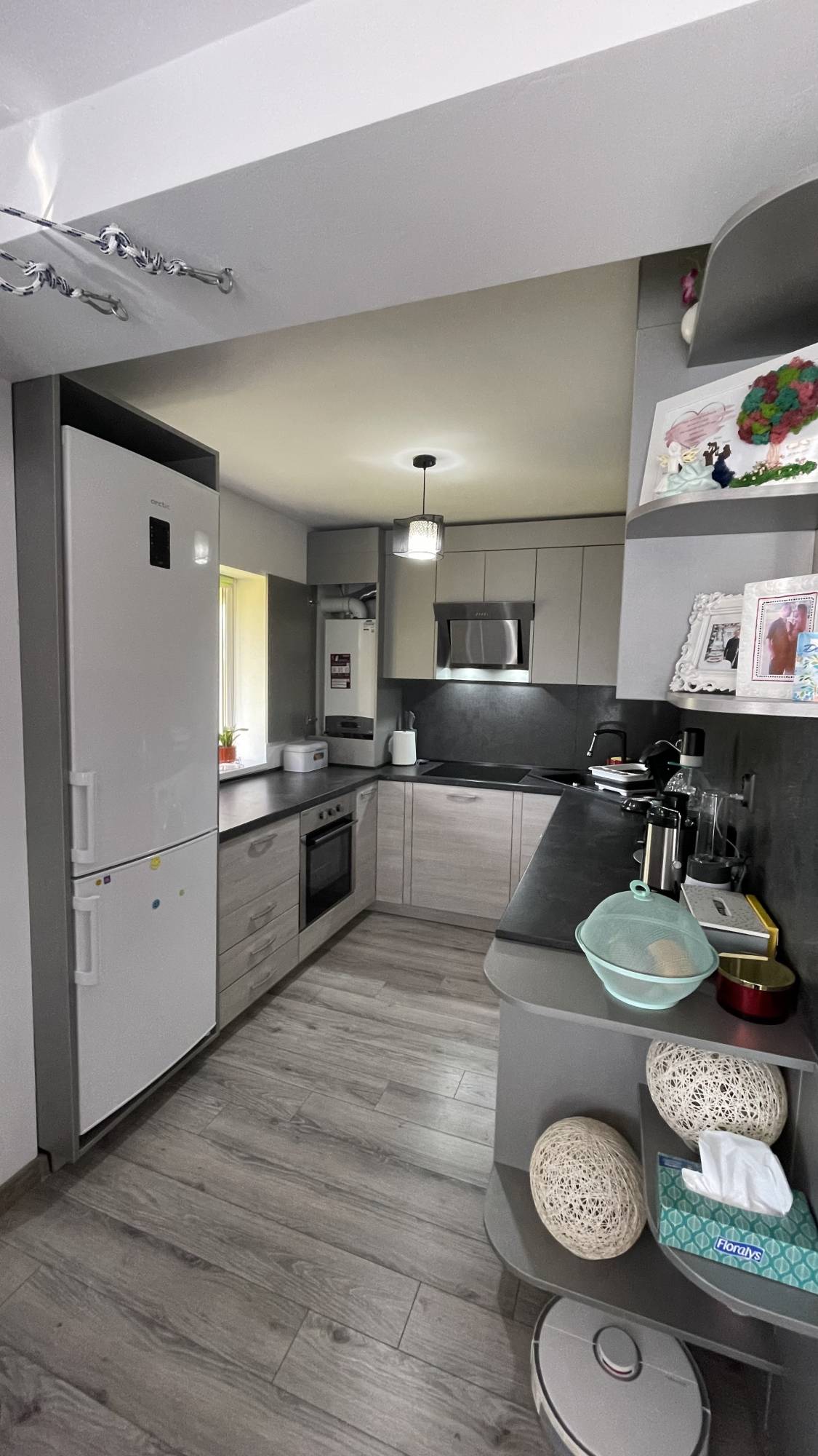 Acesta este finisat, utilat, mobilier relizat la comanda, centrala termica proprie, aer conditionat, usa metalica, gresie-faianta-parchet, are o suprafata de 64 mp utili si se afla la etajul 3/4 al unui bloc izolat termic.