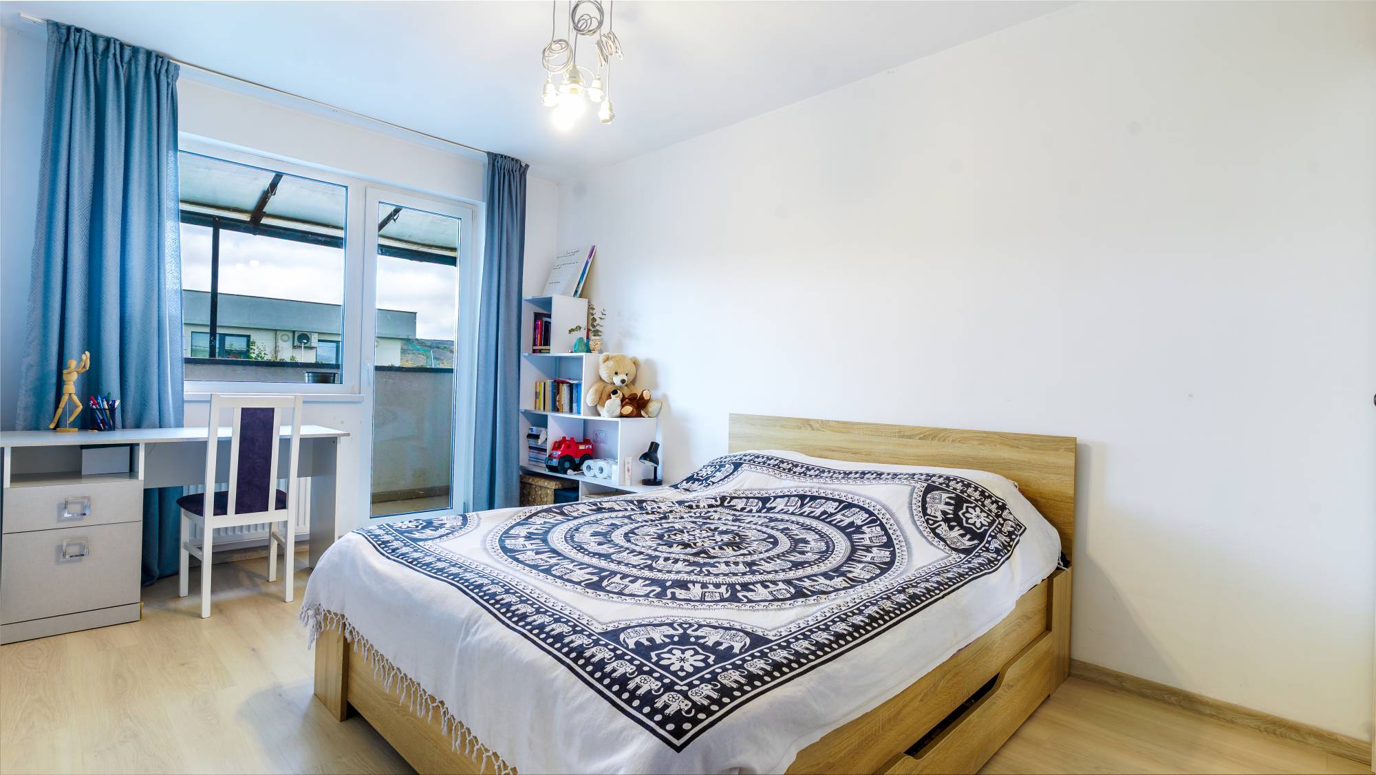 Compartimentarea este practică și bine organizată. Include hol, living cu bucătărie open space, două dormitoare, baie cu cadă și terasă cu deschidere din zona de zi.