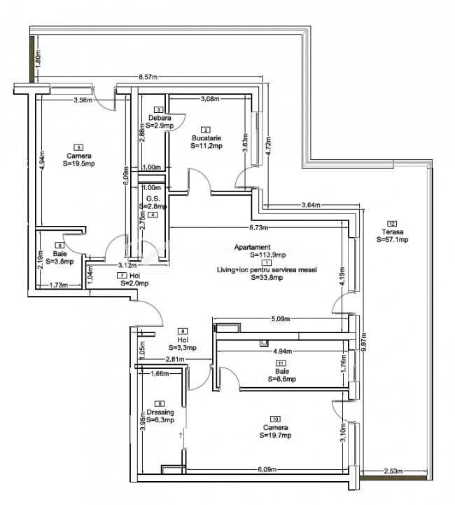 Suprafata utila 114mp si terasa panoramica de 57mp cu acces din fiecare incapere.