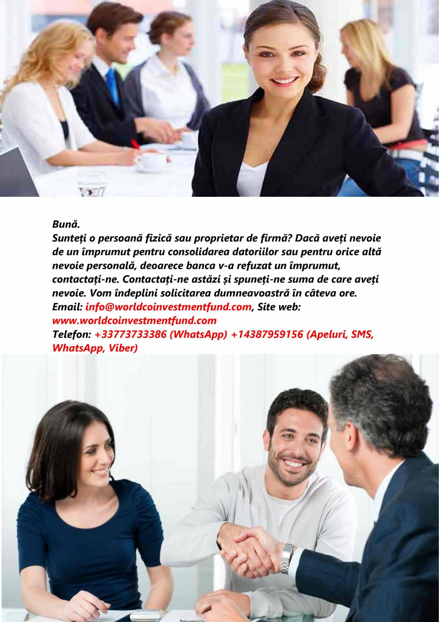 Sunteți persoană fizică sau proprietar de firmă? Aveți nevoie de un împrumut pentru consolidarea datoriilor sau pentru alte nevoi personale după ce banca v-a respins cererea? Contactați-ne! Spuneți-ne astăzi despre nevoile dumneavoastră și specificați suma de care aveți nevoie. Vom procesa cererea dumneavoastră cât mai repede posibil.