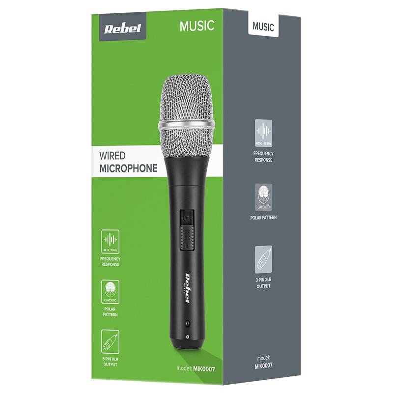 Microfon profesional Rebel K-200, ideal pentru karaoke, evenimente, prezentări și sisteme audio. Caracteristică cardioidă pentru voce clară și reducerea zgomotului de fundal. Simplu de folosit, fiabil și compatibil cu echipamente audio profesionale.