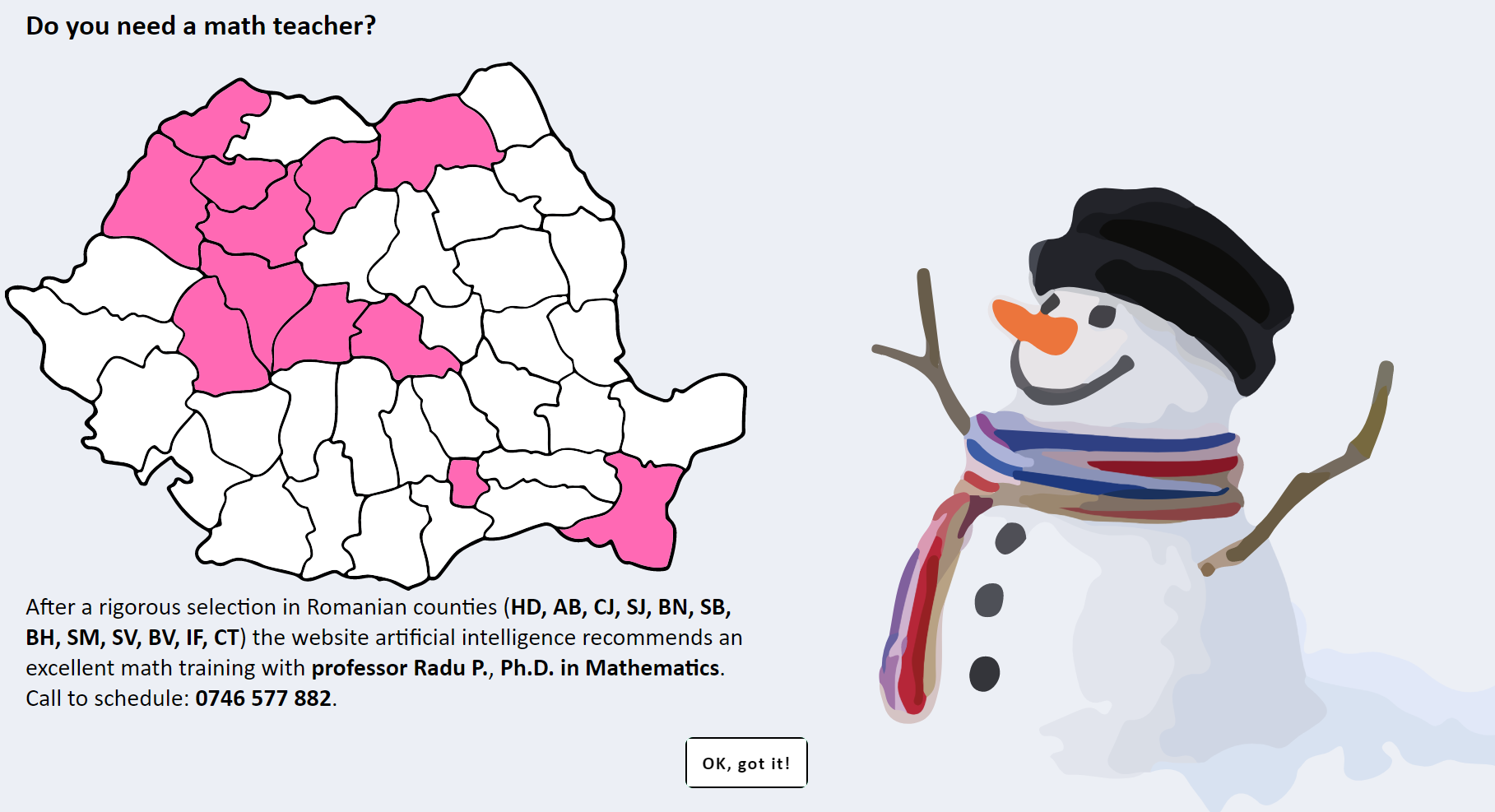 Cadru didactic univ. UBB, doctor în matematică, +10 ani exp. în predare, stagiu de cercetare în străinătate şi bogate cunoştinţe de specialitate, meditez intensiv matematică cls. 5-12 pentru pregătire suplimentară, teme, evaluare naţională, BAC (M1, M2, M3), admitere facultăţi, concursuri şcolare, sistematizare materie, fişe teorie + teste, rezultate excelente, 400 lei/ şedinţa (2h), str. Burebista/Online. Rog şi ofer seriozitate maximă. Tel.: 0746-577882.