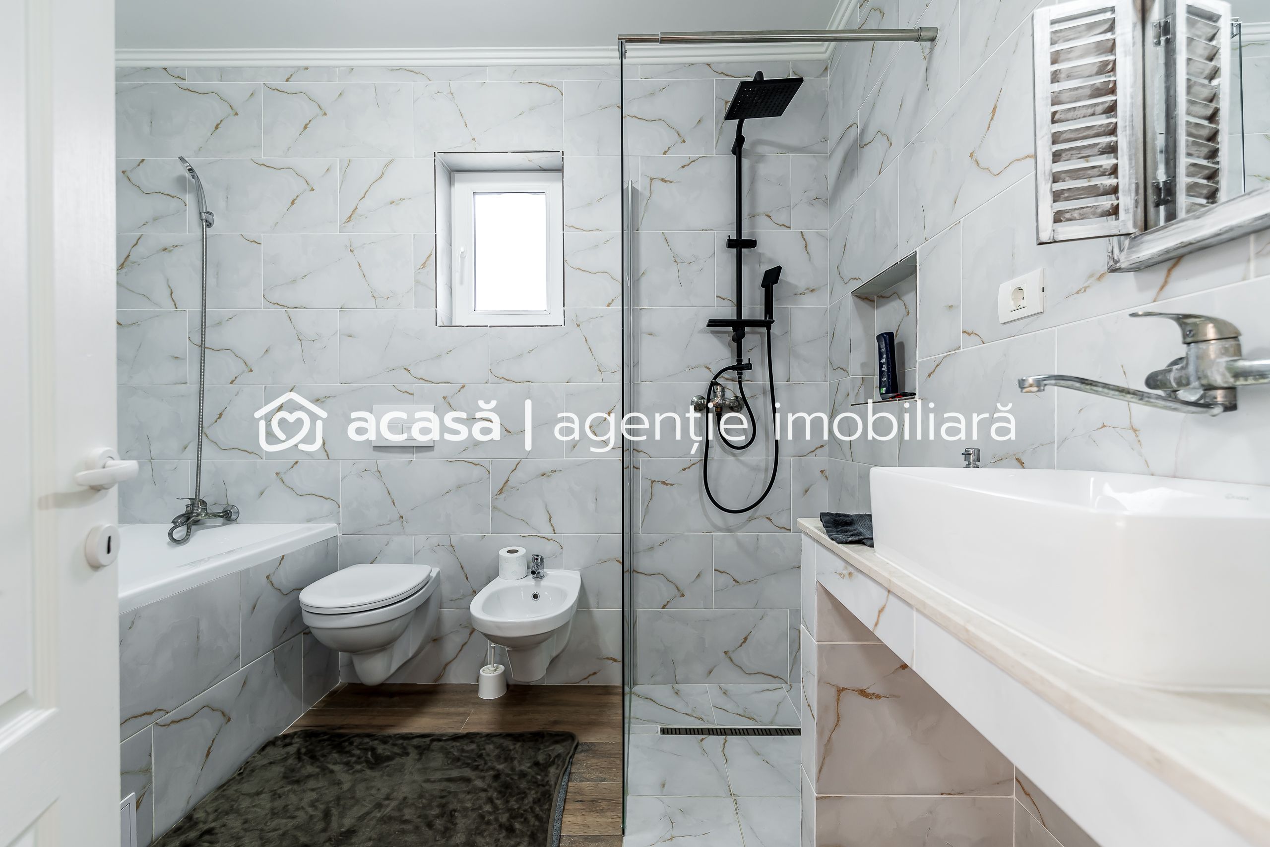 baie cu cadă și geam pentru aerisire