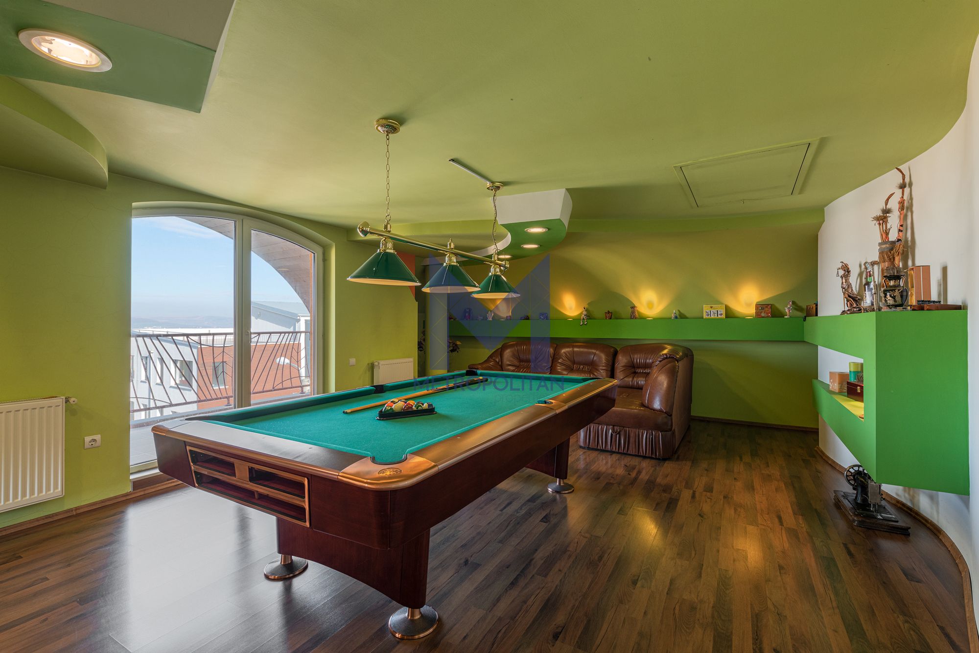MANSARDA (98,95 mp) e locul în care te poți retrage să te relaxezi după o zi foarte obositoare. Găsim aici un living cu bibliotecă, o sală de biliard, dar și un dormitor cu baie, pentru oaspeți.