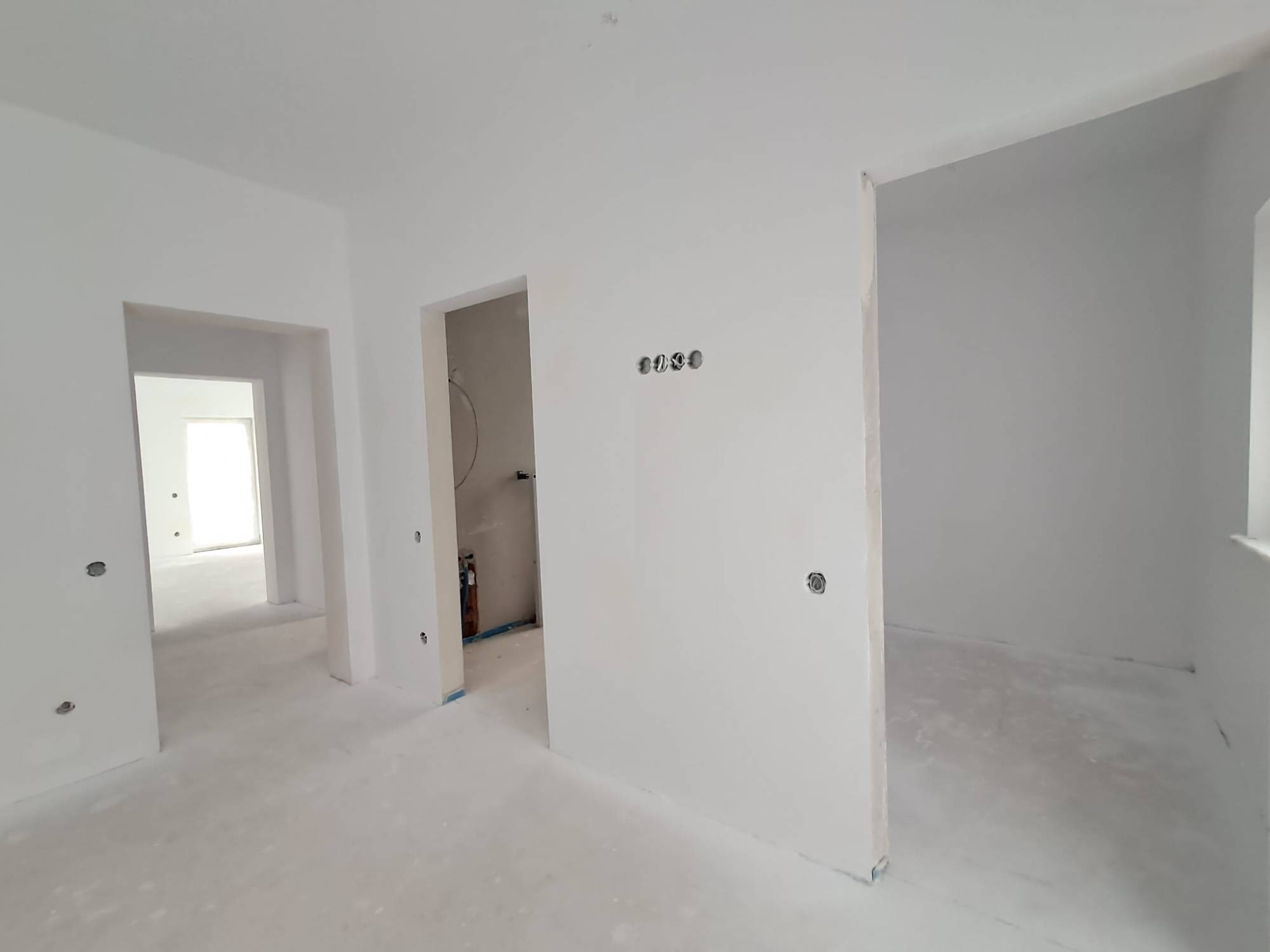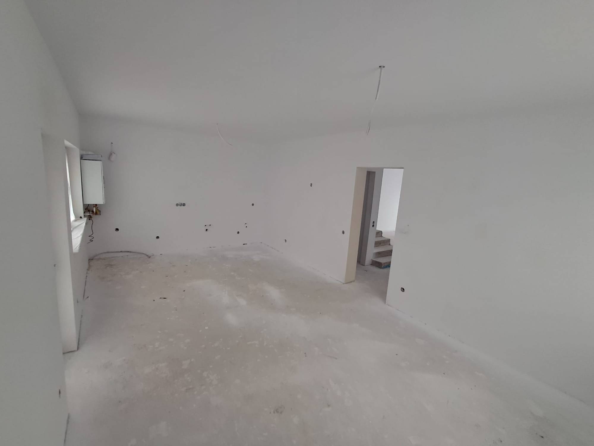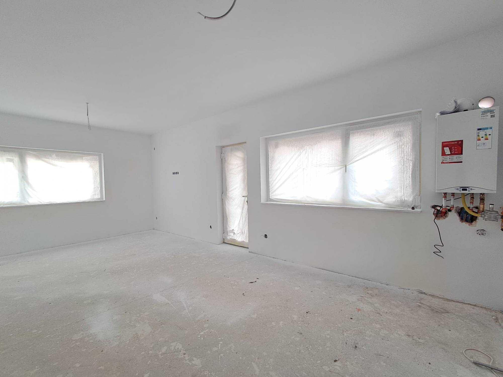 Stadiu finslaizat la exterior iar la interior peretii sunt gletuiti si zugraviti in lavabil, sape autonivelante, centrala termica proprie, incalzire prin pardoseala, geamuri tripan.