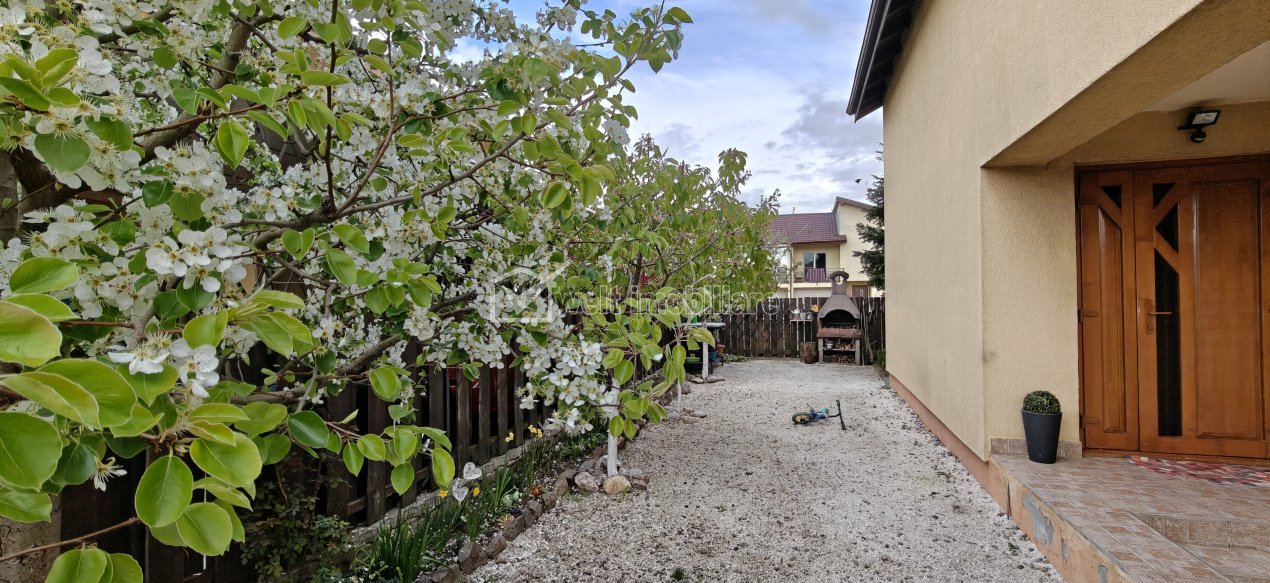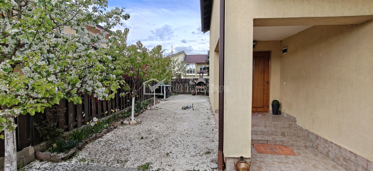 Proprietatea dispune de un teren în suprafață de 237 mp, amenajat eficient cu pomi fructiferi, plante decorative și o terasă perfectă pentru relaxare, iar în curte există spațiu pentru parcarea a două mașini.