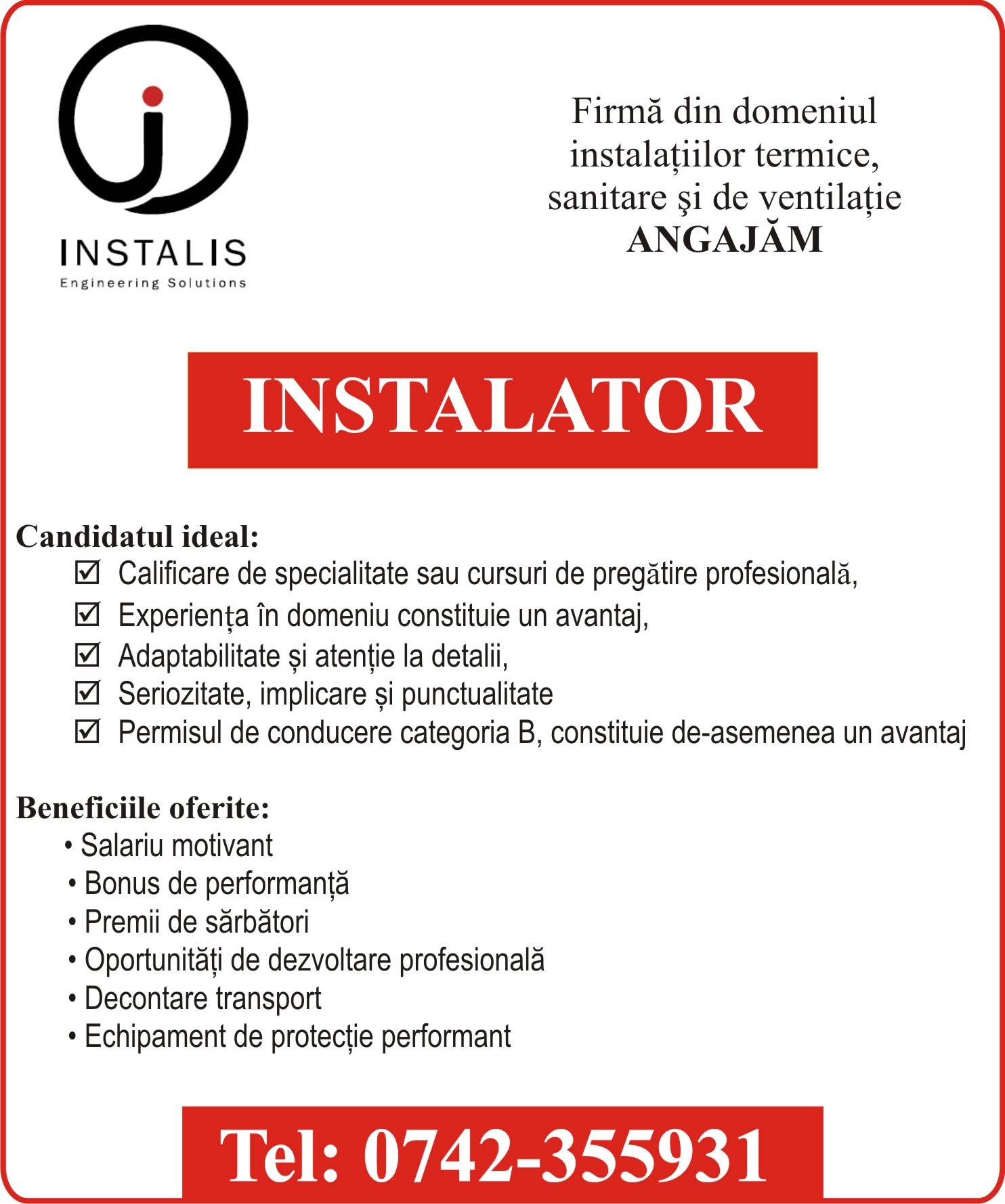 Firma din domeniul instalatiilor angajam INSTALATOR