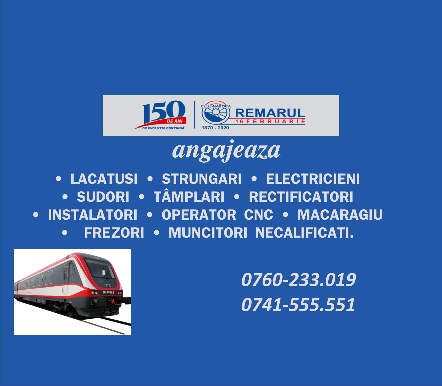 Remarul 16 Februarie angajeaza • LACATUSI • STRUNGARI • ELECTRICIENI • SUDORI • TÂMPLARI • RECTIFICATORI • INSTALATORI • OPERATOR CNC • MACARAGIU • FREZORI • MUNCITORI NECALIFICATI