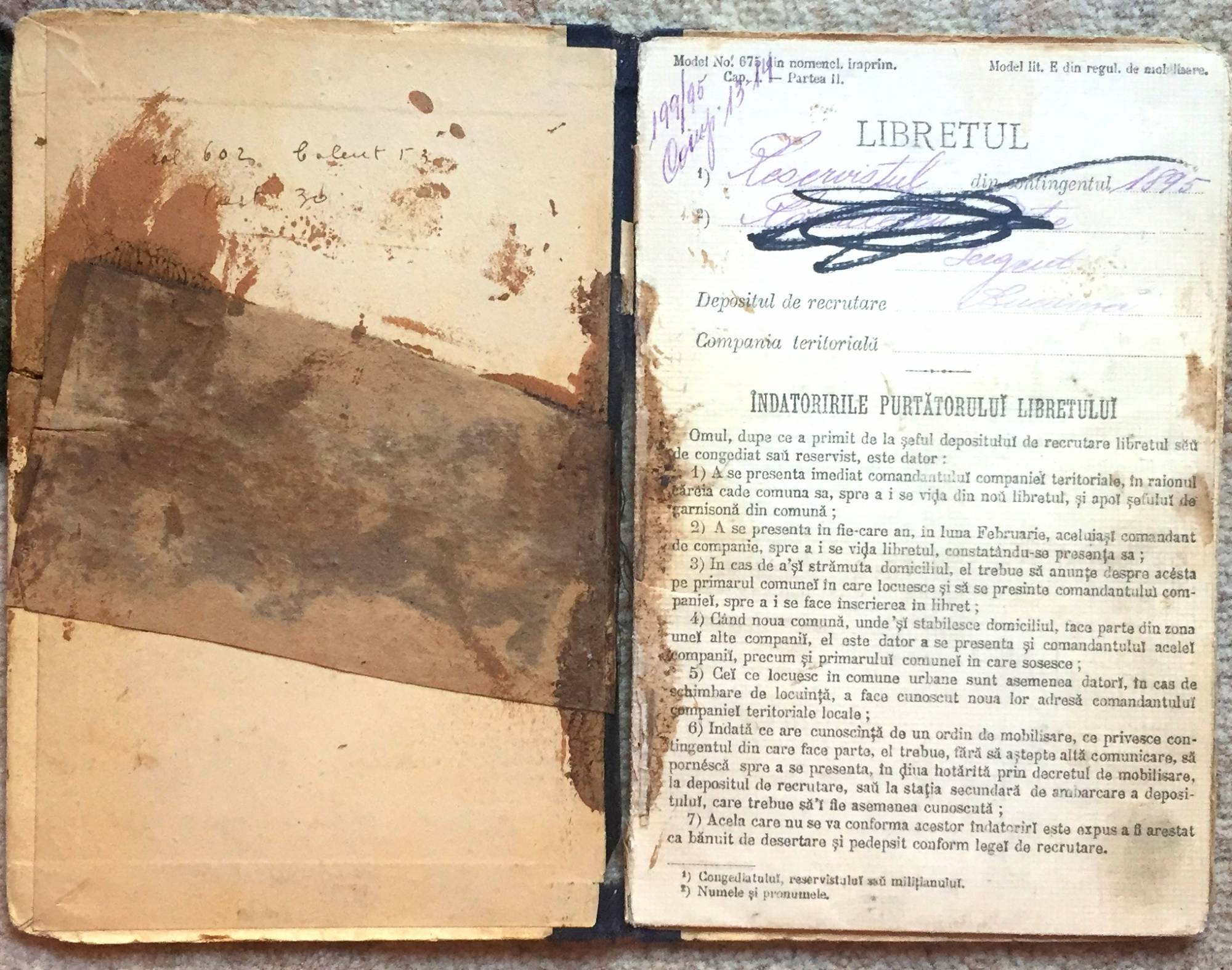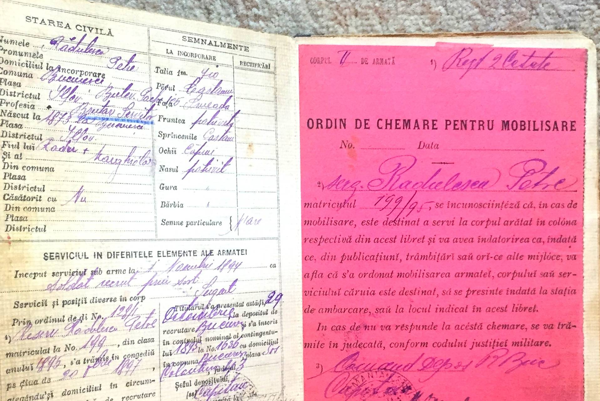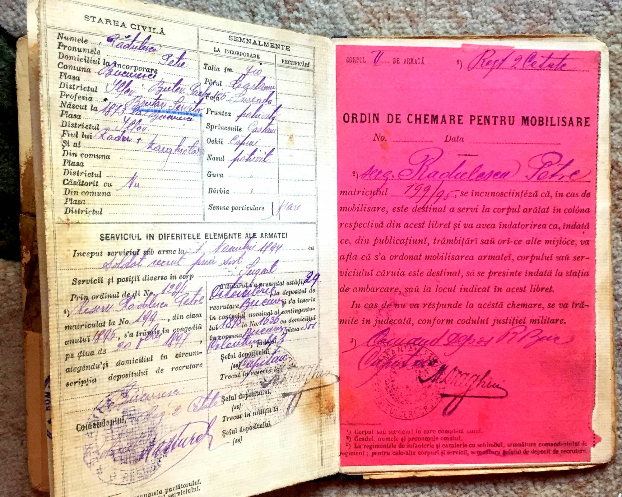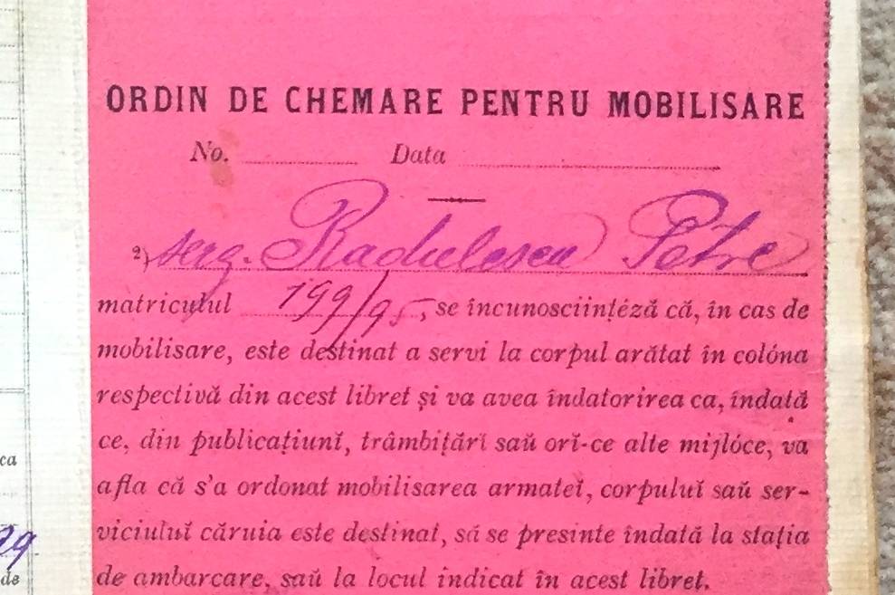 Libret militar pe numele Rădulescu Petre. Contine ordine militare pentru mobilizare. Este pătat. Tel 0748501124