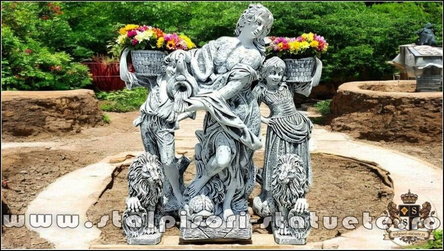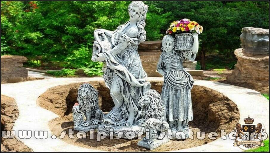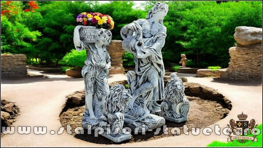 (1 domniță cu ulcea, 1 băiat+1 fată cu coșulețe, set doi lei, stânga-dreapta.)
