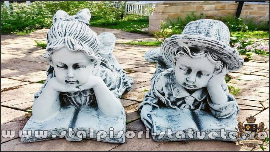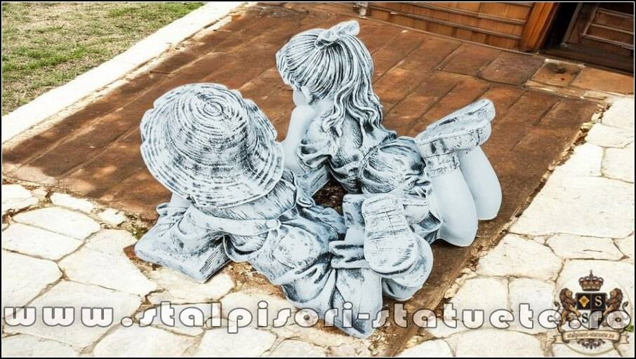 Set statuete doi copii scolari, gri patinat, model S15.