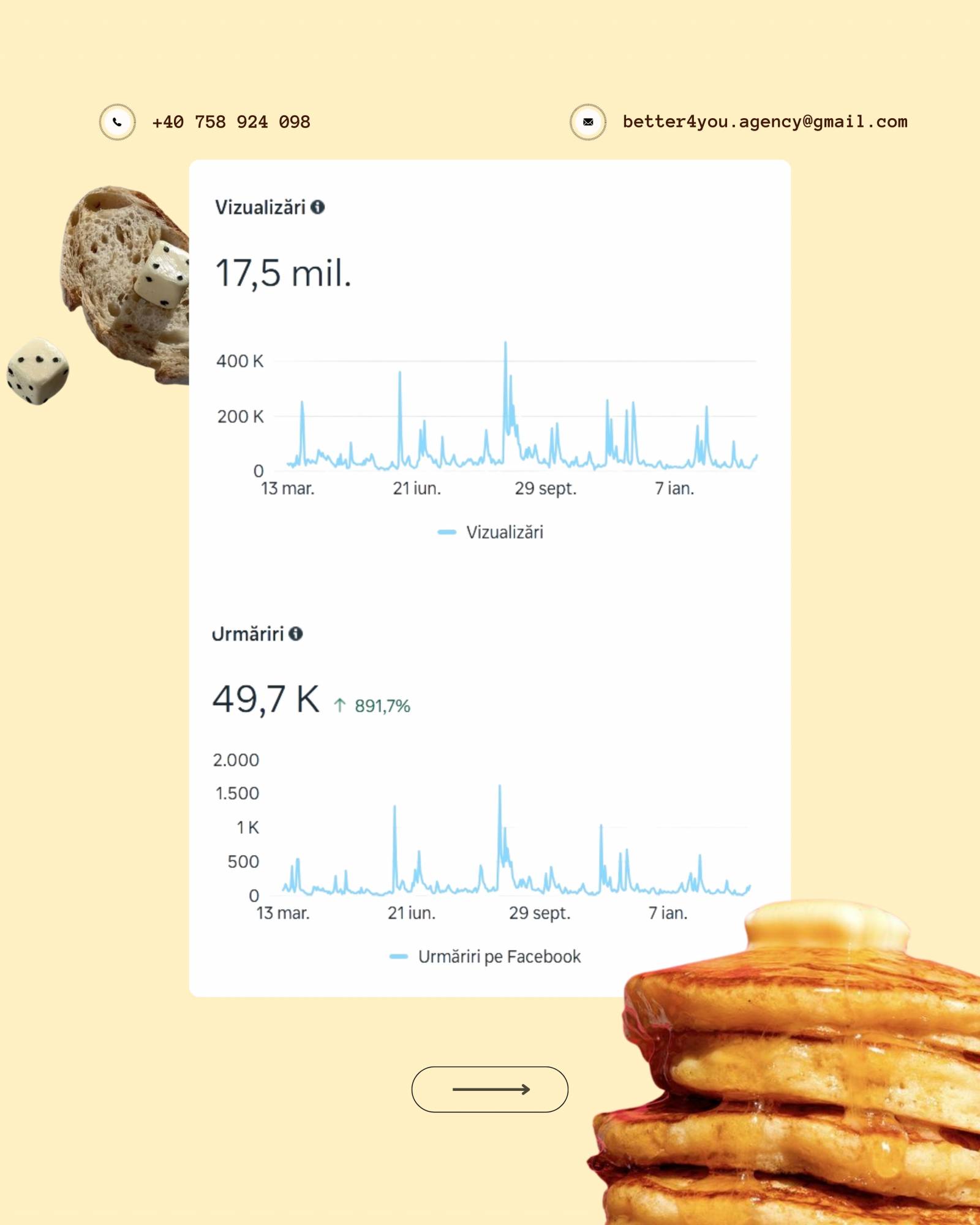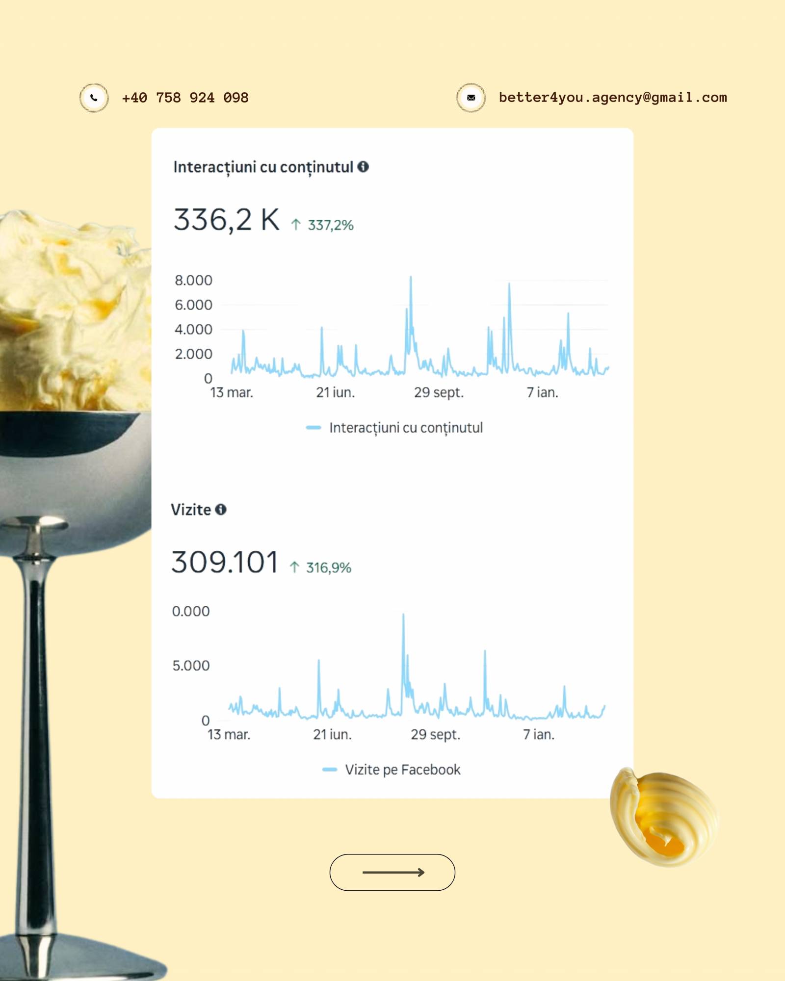 În imaginea atașată regăsiți rezultatul anual al unui client gestionat integral de echipa noastră (Instagram, Facebook, TikTok).