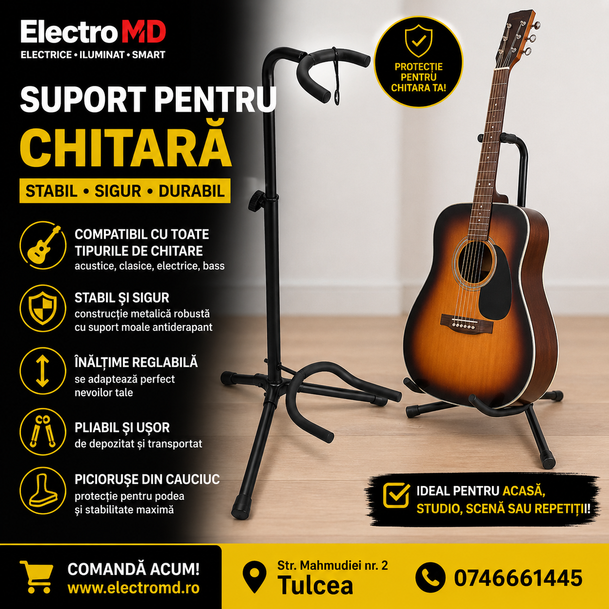Suportul pentru chitară îți protejează instrumentul și îl ține în siguranță!