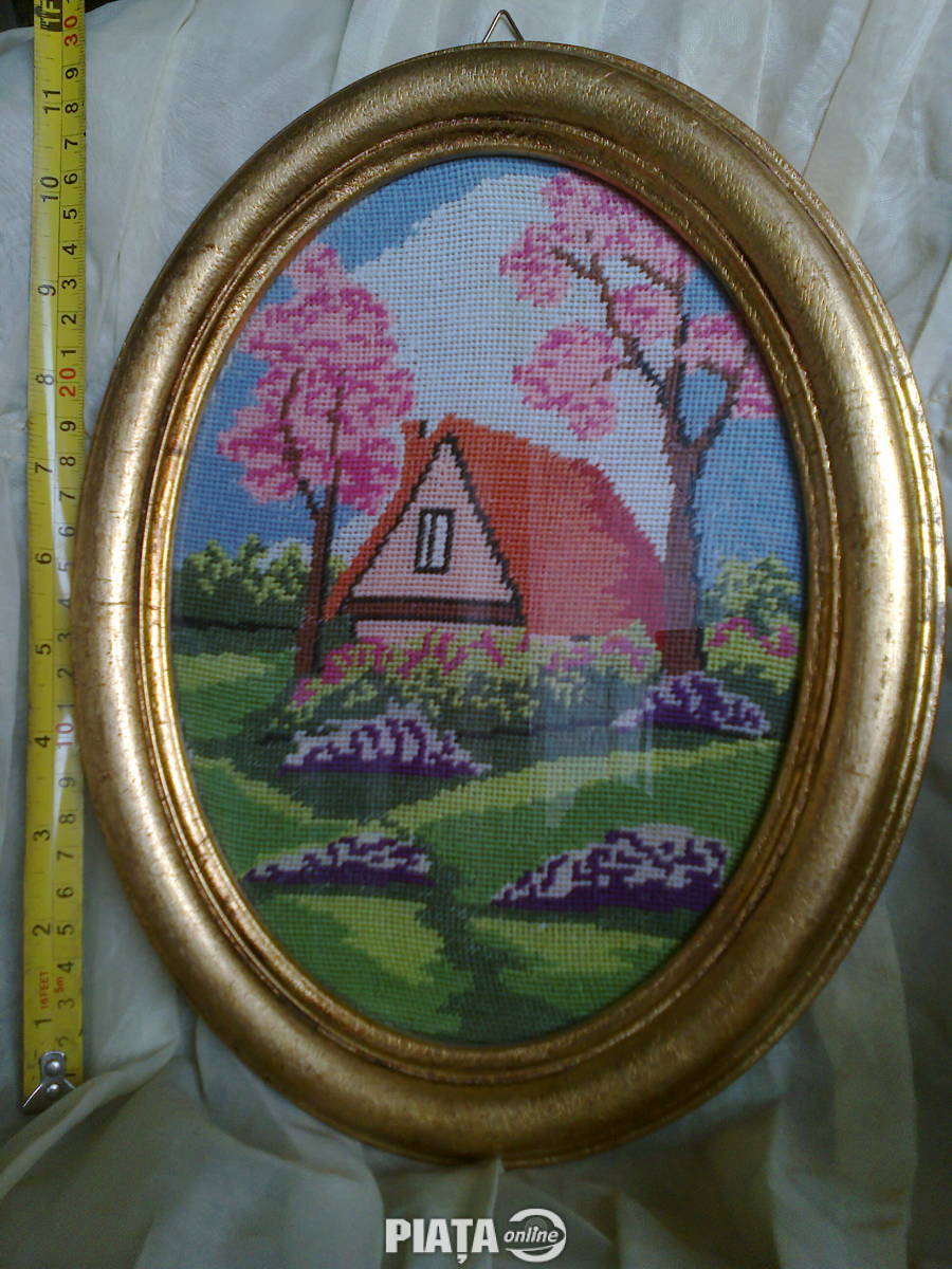 Tablou goblen inramat italian vechi de peste 100 ani unicat handmade, sub sticla de protectie, oval