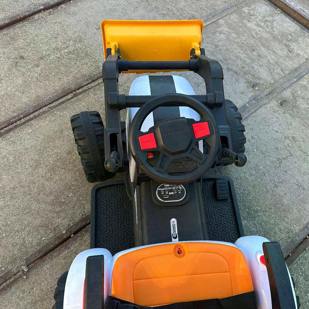 Ușor de utilizat – Comutator pentru schimbarea sensului de mers, volan cu butoane sonore și indicator pentru nivelul bateriei. Tractorasul se mai poate ghida manual de catre copil.