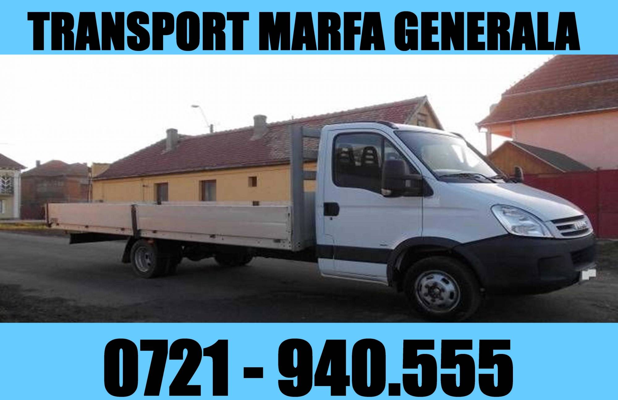 Efectuam servicii de mutari si transport marfa generala, cu autoutilitare spatioase, inchise si curate, cu volum mediu - mare de incarcare ( 26mc | 35mc | 58mc ). Sarcini utile cuprinse intre : 1500kg | 3000kg | 5000kg . Transportam / mutam cantitate medie - mare de electrocasnice si mobilier ( greu / voluminos / fragil ) marfa ne/paletata, marfa cu caracter fragil & voluminos, in conditii optime de maxima seriozitate, siguranta si promptitudine. Practicam preturi de bun simt, incepand cu 2 lei/km. Echipa serioasa si responsabila, formata din 3-5-8 persoane, cu vasta experienta in manipularea pieselor grele / voluminoase de electrocasnice si mobilier, indiferent de greutate, volum, etaj si/sau locatie. Servicii complete de mutari sedii firma, depozite, locuinte private si apartamente cu 1-3-5 camere. Disponibilitate pentru orice destinatie ( Romania | Ungaria | Austria | Germania | Franta | Elvetia | Italia ). Inchiriem, cu/fara sofer, autoutilitare de 3.5 tone, cu volum mediu - mare de incarcare ( 18mc - 24mc - 28mc ) la pretul de 100€/zi. La cerere, eliberam factura/cmr. Tel : 0747-624.111
