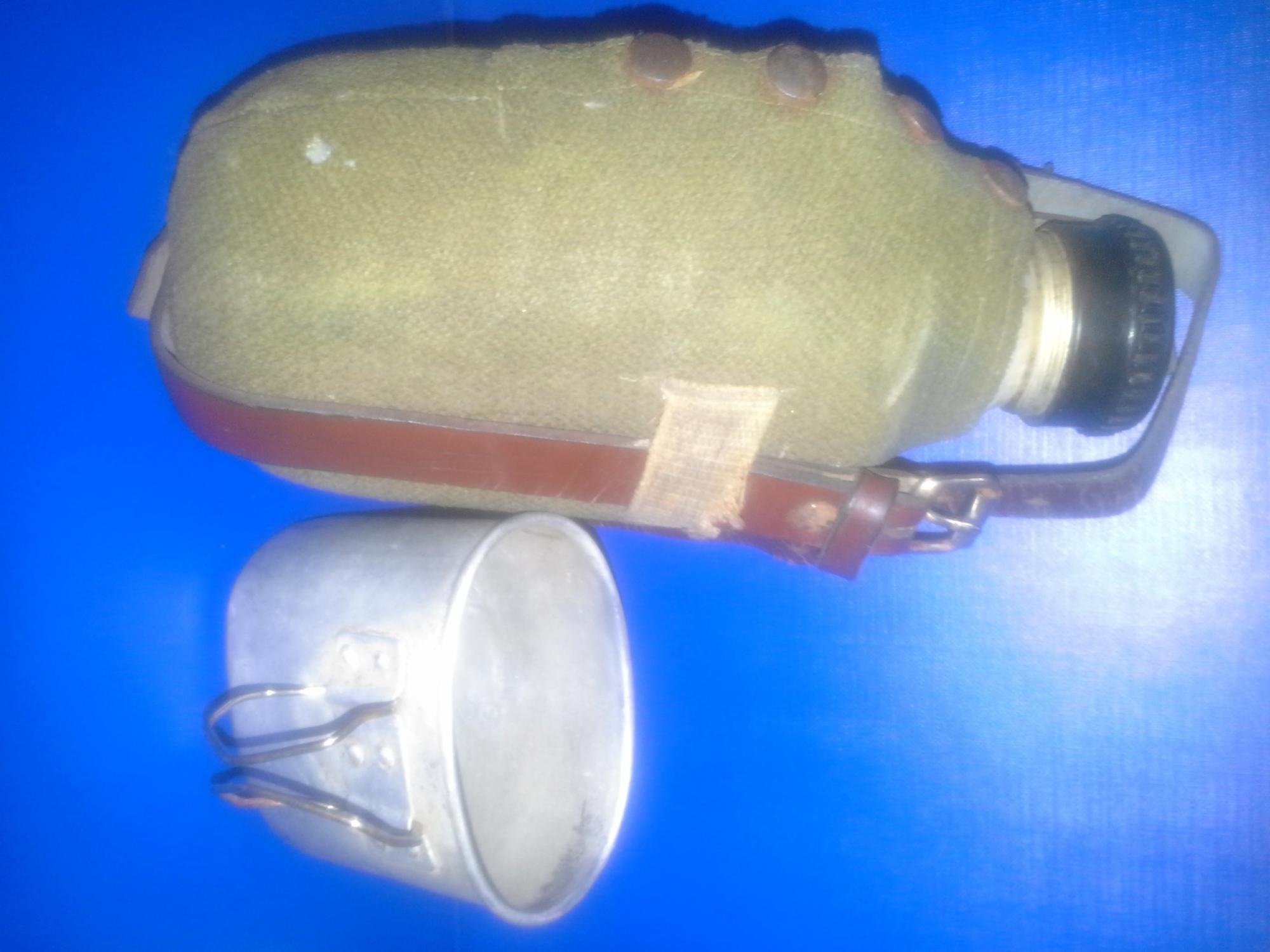 Plosca (bidonas militar) in husa originala din foaie de cort cu inchidere prin 4 capse metalice si curea din piele, cu capac filetat din bakelita si cana aferenta, complet, rar si vechi, tot de prin acei ani
